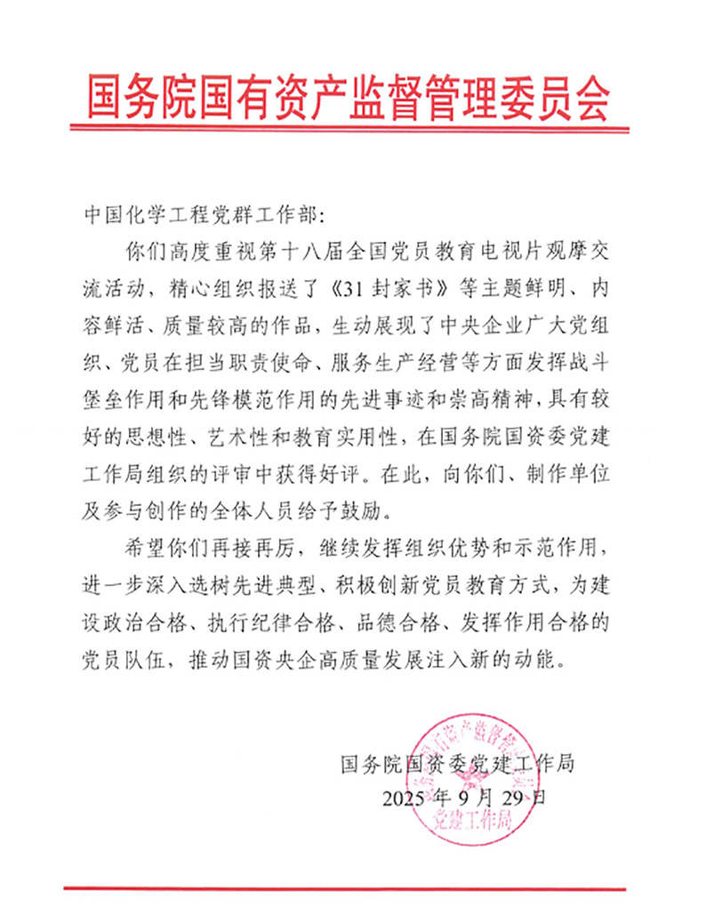 近日,由华体会体育(中国)HTH·官方网站原创的党员教育片《31封家书》再传捷报!该作品经中国化学工程集团有限华体会体育(中国)HTH·官方网站党委推荐,参与中央组织部第十八届全国党员教育电视片观摩交流活动,并获得国务院国资委党委的高度评价,专门发来鼓励函予以表彰。这一荣誉不仅是对作品艺术价值的肯定,更是对中国化学三化建人“家国情怀”与“硬核担当”的生动诠释。