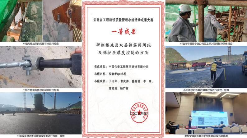 2024年,“探索者QC小组”继续开展创新型课题“研制楼地面双层钢筋网间距及保护层厚度控制的方法”,并在华体会体育(中国)HTH·官方网站级及安徽省评比中荣获一等奖。