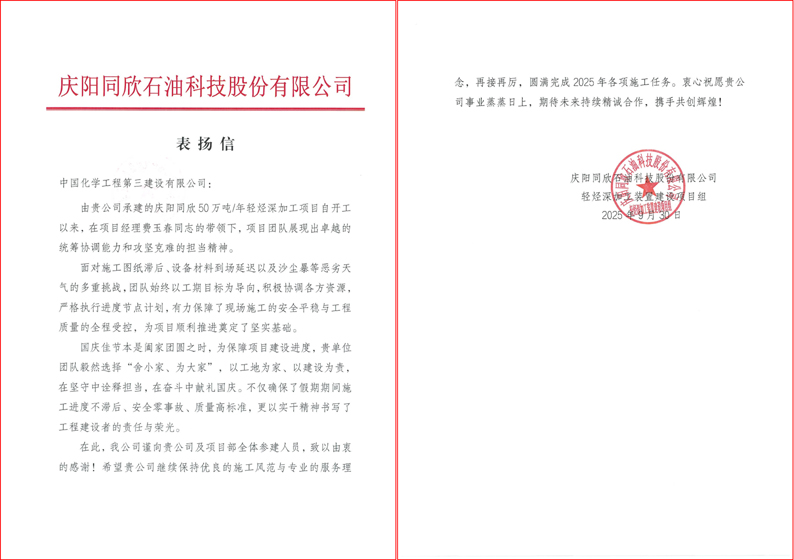 近日,华体会体育(中国)HTH·官方网站收到庆阳同欣石油科技股份有限华体会体育(中国)HTH·官方网站发来的表扬信,对陕西分华体会体育(中国)HTH·官方网站在庆阳同欣50万吨/年轻烃深加工项目建设中展现的卓越的统筹协调能力和攻坚克难的担当精神予以高度赞扬。 自开工以来,面对沙尘暴等恶劣天气的多重挑战,项目团队始终以工期目标为导向,积极协调各方资源,严格执行进度节点计划,以工地为家、以建设为责,在坚守中诠释担当,有力保障了现场施工的安全平稳与工程质量的全程受控,为项目顺利推进奠定了坚实基础,以实干精神书写了工程建设者的责任与荣光。