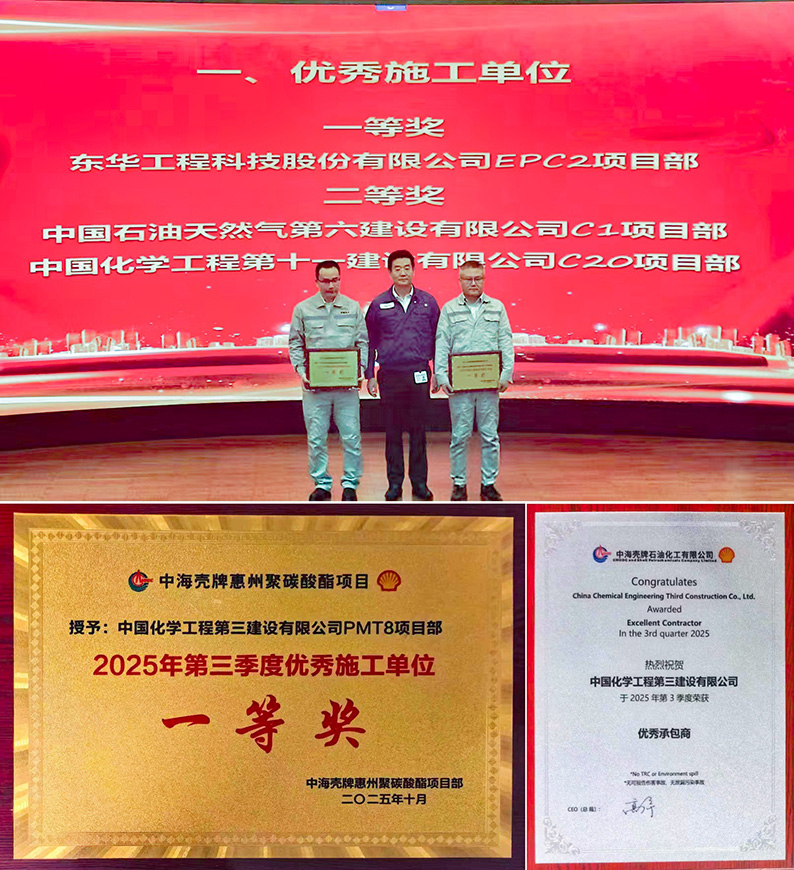 潘新宇出席中海壳牌石油化工有限华体会体育(中国)HTH·官方网站高层会议。会上,华体会体育(中国)HTH·官方网站凭借在中海壳牌惠州聚碳酸酯项目建设中“零事故、零延误、高标准”的卓越表现,荣获 “三季度优秀承包商”及“优秀施工单位一等奖”。此次表彰是基于安全管控、工程质量、进度协调及技术创新等多维度的综合评估,彰显了华体会体育(中国)HTH·官方网站在项目建设中的综合实力。作为中海壳牌惠州三期乙烯项目的重要组成部分,聚碳酸酯项目涵盖26万吨/年聚碳酸酯、24万吨/年双酚A及22万吨/年碳酸二苯酯装置,并配套建设研发中心。项目建成后,将年产32万吨高性能特种化学品,产品广泛应用于汽车轻量化、医疗包装、电子元器件等高端领域,有效填补国内高端聚碳酸酯市场缺口。