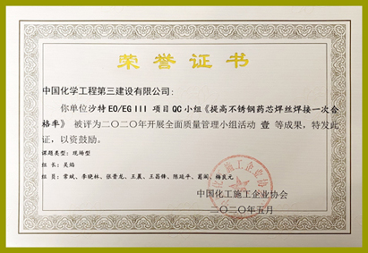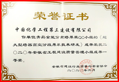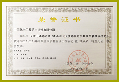 青岛分华体会体育(中国)HTH·官方网站金能产品分离塔吊装QC小组“超重超高大直径分离塔多段高空吊装技术研发”QC成果、沙特EO/EG Ⅲ项目QC小组“提高不锈钢药芯焊丝焊接一次合格率”QC成果荣获中国化工施工企业协会“二0二0年全面质量管理小组活动”一等成果。