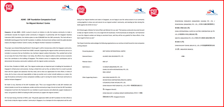 随着新冠疫情在新加坡的蔓延,外籍客工成为当地疫情防治工作的重点与难点。日前,新加坡中小企业商会成立“新加坡工商联合总会基金会外籍客工关怀基金”,并组织发起募捐活动。收到募捐信息后,新加坡分华体会体育(中国)HTH·官方网站第一时间组织开展捐款活动,迅速募集捐款1000元新币,助力打赢疫情防控阻击战。