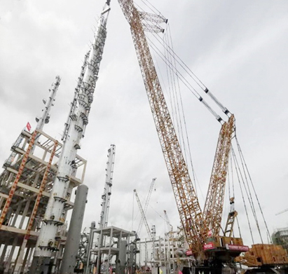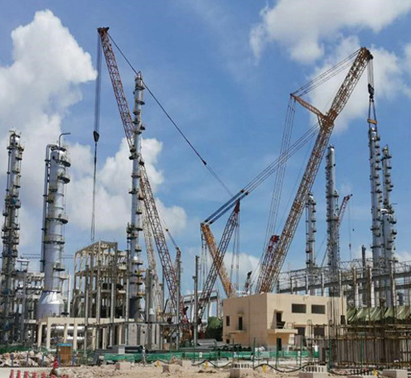 此次吊装的10台大型塔器中的4台,采用4000吨履带吊主吊,750吨履带吊溜尾。其余6台塔器采用1000吨履带吊主吊,400吨履带吊溜尾。10台大型塔器中2台甲醇洗涤塔最大最重,每台重860 吨,直径4m,高93.5m。