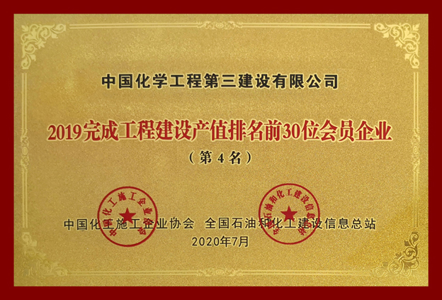 2019年,全国化工建设行业积极应对国内外复杂多变的经济环境和各种严峻挑战,行业发展规模不断扩大,发展质量不断提高。为进一步弘扬行业先进,推进行业持续健康发展,中国化工施工企业协会、全国石油和化工建设信息总站日前联合开展2019年度“全国化工建设行业企业生产规模年度排名”活动,华体会体育(中国)HTH·官方网站凭借2019年度主营业务收入,荣获“2019年完成工程建设产值排名前30位会员企业(第4名)”。
