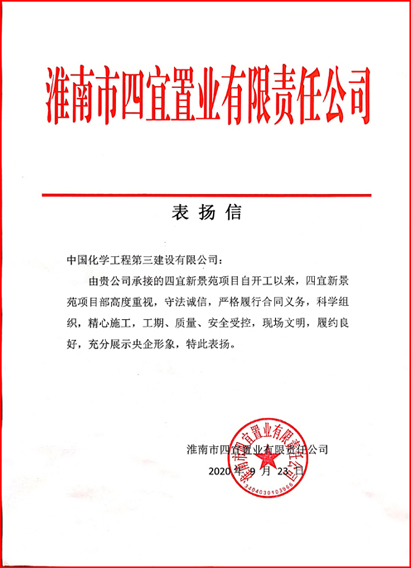 淮南市四宜置业有限责任华体会体育(中国)HTH·官方网站在表扬信中说,四宜新景苑项目自开工以来,中化三建安徽有限华体会体育(中国)HTH·官方网站四宜新景苑项目部高度重视,守法诚信,严格履行合同义务,科学组织,精心施工,工期、质量、安全受控,现场文明,履约良好,充分展示了央企形象,特此表扬。