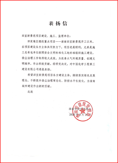 淮南市建筑管理处在表扬信中说,田家庵区棚改重点项目—淮南四宜新景苑项目开工以来,在各方的共同努力下,项目进展顺利,尤其是总承包单位中化三建,按照安全文明标准化工地标准组织施工,扬尘治理工作取得较大成效,为改善我市大气环境质量、创建文明城市做出了积极贡献。经研究决定,对中化三建予以通报表扬。希望四宜新景苑项目各方建设主体,继续落实绿色发展理念,不断提升扬尘治理常态化、长效化,为淮南城市建设做出新贡献。