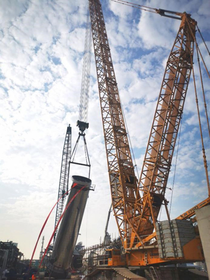 安装工程二华体会体育(中国)HTH·官方网站淄博项目队进点以来,遇到附塔管道材料到场时间延后、设备到场时间顺序不定、工期紧张等的不利因素。在项目部积极组织协调下,各专业华体会体育(中国)HTH·官方网站相互配合、优化工序、合理安排安装和保温工作工序,最终克服困难,顺利完成附塔管线、塔平台安装。脱乙烷汽提塔下段吊装当天,项目队对吊装机索具进行严格检查,并对吊装作业人员进行安全技术交底,确保吊装前各项准备工作就绪。吊装采用750t履带吊主吊、250t履带吊溜尾的吊装方案。上午9时18分,下段开始起吊,在两台履带吊及现场指挥人员的默契配合下,下段徐徐平稳精准就位,如期完成吊装工作,充分展示了项目队及各参战单位勠力同心、攻坚克难精神。