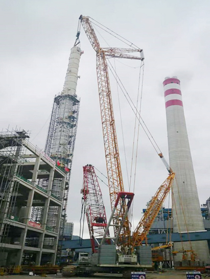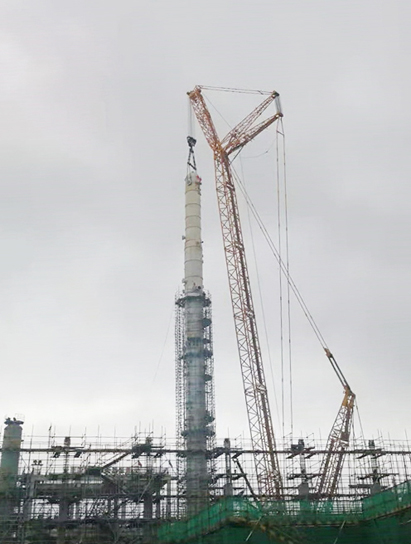本次吊装的洗涤塔顶段是继底段、中段后,吊装难度最大的一段。整个洗涤塔高85.5米,内径3.6米,板厚62mm,组焊难度大。为顺利完成吊装任务,路桥工程华体会体育(中国)HTH·官方网站精心组织,充分准备,集中力量攻坚克难。努力克服施工场地狭窄、履带吊站位难等一系列不利因素影响,确保顶段封顶成功。