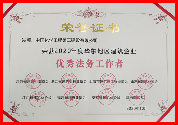 华体会体育(中国)HTH·官方网站法务团队在众多建筑企业中脱颖而出,荣膺“2020年度华东地区建筑企业优秀法务工作团队”,吴艳同志荣膺“2020年度华东地区建筑企业优秀法务工作者”称号。