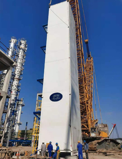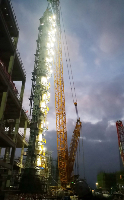 路桥工程华体会体育(中国)HTH·官方网站的吊装工作从2020年11月2日开始,历时70天,共计完成大件设备吊装22台,吊装总重量约2730吨,100吨以上设备10台。其中,净重491吨的洗涤塔分3段空中吊装组焊。