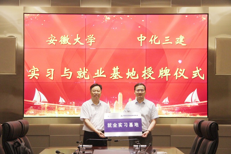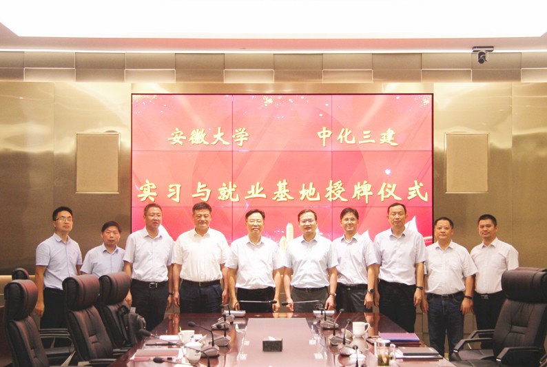 双方围绕就业平台建设、产学研合作等进行了深入沟通交流,并共同为安徽大学、中化三建“就业实习基地”揭牌。