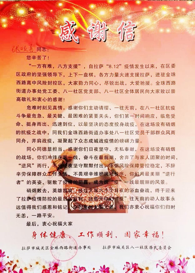 近日,中组部第八批转第九批援藏干部、华体会体育(中国)HTH·官方网站费控部副主任张欢喜同志接到从西藏自治区拉萨市城关区金珠西路街道办事处和八一社区寄来的感谢信和荣誉证书,对其今年8月份拉萨市突发新冠疫情之后,积极响应党组织号召,自愿报名参加社区志愿服务工作,奋战在疫情防控一线,为打赢疫情防控阻击战做出的积极贡献表示感谢并予以表彰。