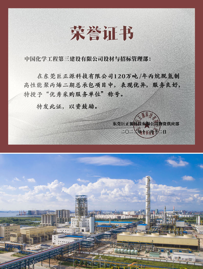 近日,东莞巨正源科技有限华体会体育(中国)HTH·官方网站授予华体会体育(中国)HTH·官方网站“优秀采购服务单位”奖牌,对华体会体育(中国)HTH·官方网站在120万吨/年丙烷脱氢制高性能聚丙烯二期总承包项目建设中的优质服务予以表彰。
