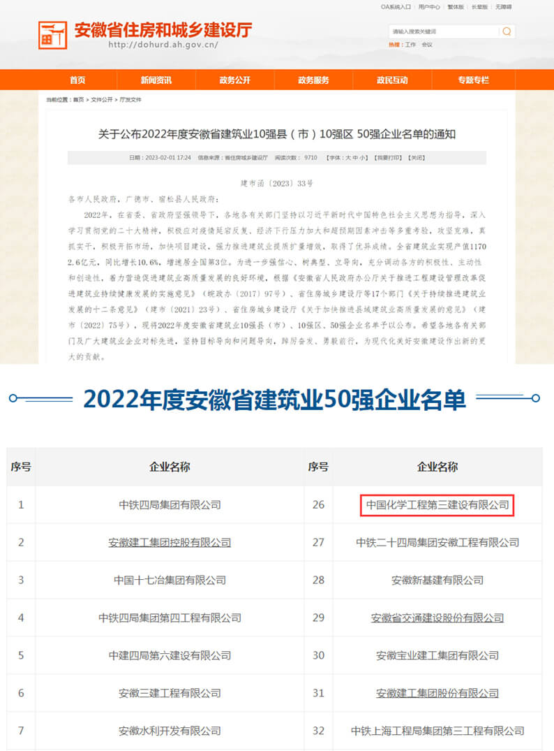 近日,安徽省住房和城乡建设厅公布2022年度安徽省建筑业10强县(市)、10强区和50强企业名单,华体会体育(中国)HTH·官方网站榜上有名,荣膺2022年度“安徽省建筑业50强企业”。