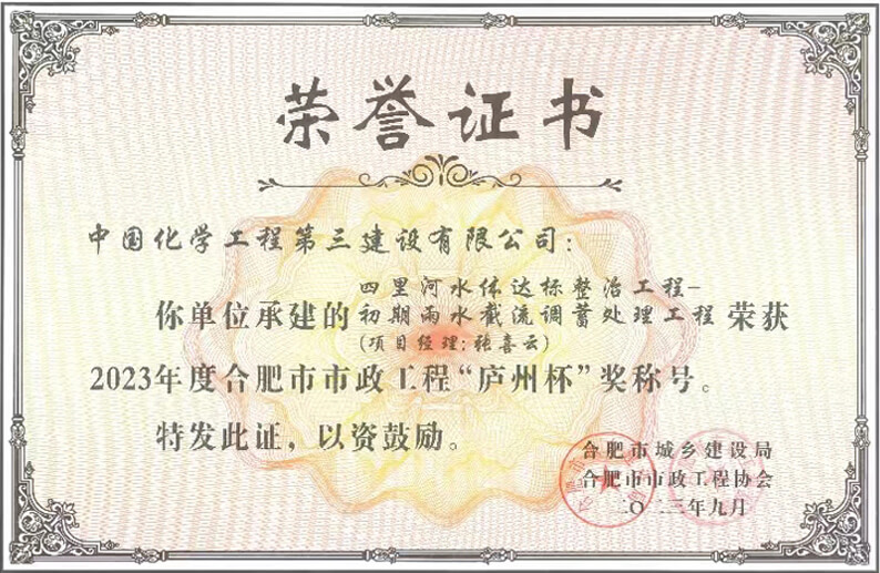 经合肥市城乡建设局审定及公示,近日,合肥市市政工程协会正式公布2023年度合肥市市政工程“庐州杯”评选结果,华体会体育(中国)HTH·官方网站承建的四里河水体达标整治工程——初期雨水截流调蓄处理项目荣获2023年度合肥市政工程“庐州杯”,这是华体会体育(中国)HTH·官方网站首次获此殊荣。