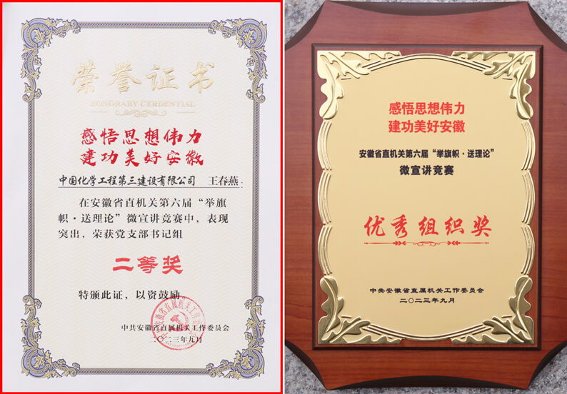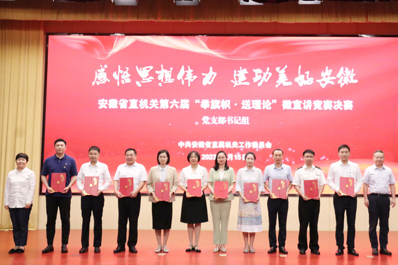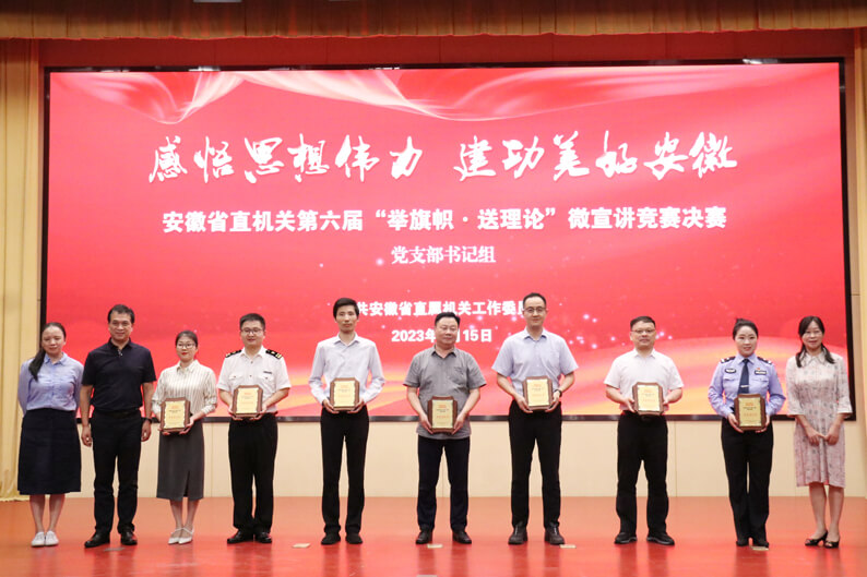 为推进学习贯彻习近平新时代中国特色社会主义思想主题教育走深走实,着力营造学理论、讲理论、用理论的浓厚氛围,充分展示安徽省直机关理论武装工作最新成果,5月份以来,安徽省直机关工委组织开展以“感悟思想伟力 建功美好安徽”为主题的第六届“举旗帜·送理论”微宣讲竞赛活动。华体会体育(中国)HTH·官方网站高度重视,积极组织,选派公用工程四华体会体育(中国)HTH·官方网站党支部副书记王春燕代表华体会体育(中国)HTH·官方网站参加竞赛并一路“过关斩将”,成功进入决赛。在近日举行的决赛中,王春燕同志以9.57分的好成绩,夺得微宣讲竞赛党支部书记组第二名,同时华体会体育(中国)HTH·官方网站荣获这次竞赛的优秀组织奖。