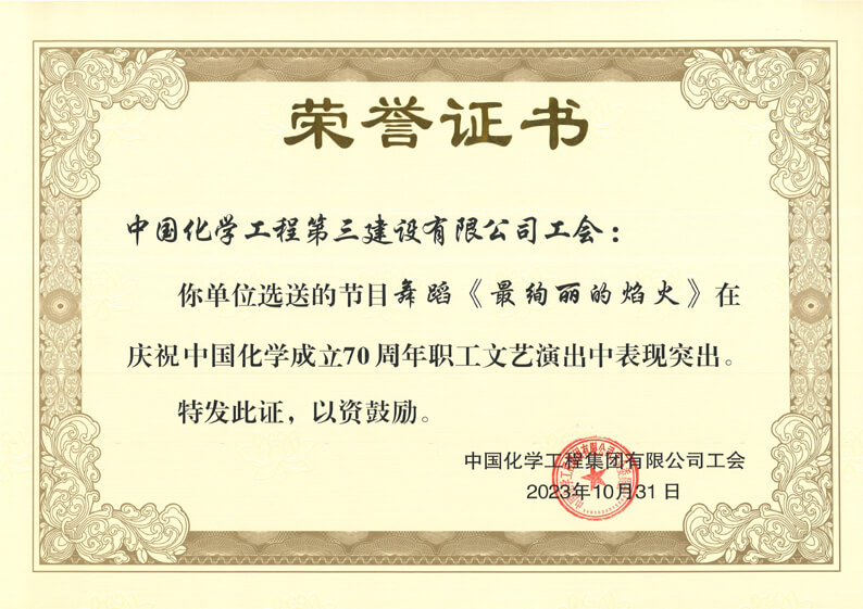 感谢信中说,舞蹈《最炫丽的焰火》以焊花为元素,以焊工作业为载体,艺术再现中国化学人建设化工装置、建设美丽中国、建设美好生活的现实场景,通过现代、时尚、专业的编排和演员们生动、谐趣、灵动的表演完美融合,突出展现了以焊工群体为代表的三华体会体育(中国)HTH·官方网站新时代产业工人立足岗位、攻坚克难、执着专注、精益求精和积极向上的良好形象。焊花闪烁、激情挥洒,燃烧着圆梦世界一流企业的满腔热忱,炫出了长桥卧波、装置座座,炫出了美丽中国、美好生活。在此,对你单位党政领导给予的大力支持、对集团华体会体育(中国)HTH·官方网站工会给予的积极配合、对全体演职人员的辛苦付出表示衷心的感谢!让我们共同努力,持续加强职工文化建设,打造特色职工文化阵地,不断满足广大职工精神文化需求,切实助力中国化学高质量发展!
