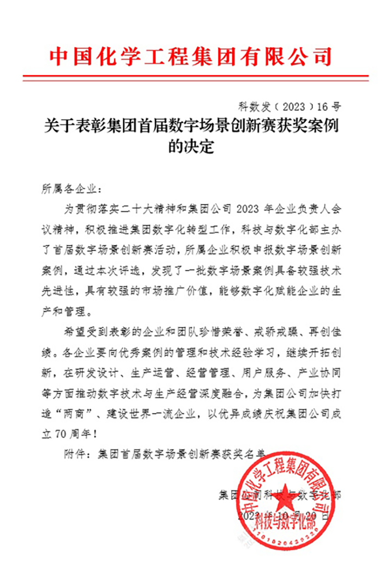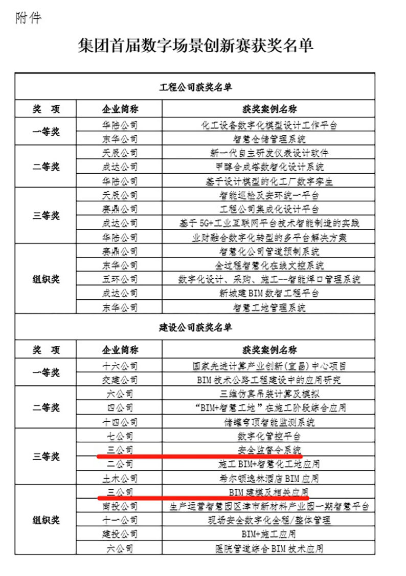 近日,在中国化学2023年数字化转型与网络安全研讨会上,华体会体育(中国)HTH·官方网站申报的“安全监督令系统”和“BIM建模及相关应用”案例分别荣获中国化学首届数字场景创新赛(建设华体会体育(中国)HTH·官方网站)三等奖和组织奖。