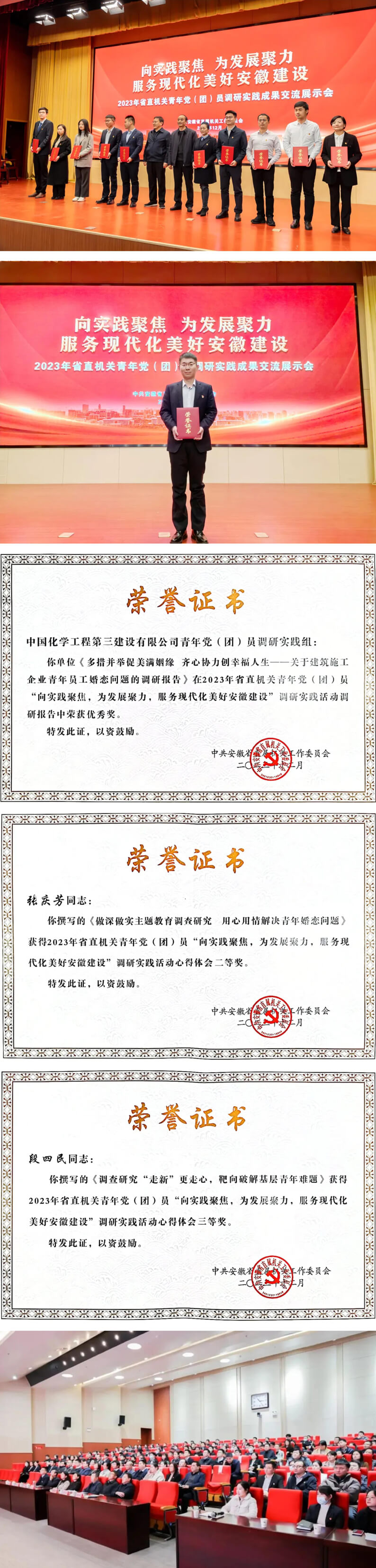 近日,安徽省直机关团工委召开省直机关青年党(团)员调研实践成果交流展示会,对2023年省直机关青年党(团)员“向实践聚焦,为发展聚力,服务现代化美好安徽建设”调研实践活动先进集体和个人进行表彰。华体会体育(中国)HTH·官方网站调研实践组围绕青年员工婚恋问题报送的《多措并举促美满姻缘 齐心协力创幸福人生——关于建筑施工企业青年员工婚恋问题的调研报告》荣获优秀奖,党委工作部张庆芳撰写的《做深做实主题教育调查研究 用心用情解决青年婚恋问题》、团委段四民撰写的《调查研究“走新”更走心,靶向破解基层青年难题》个人心得体会分别荣获二、三等奖。