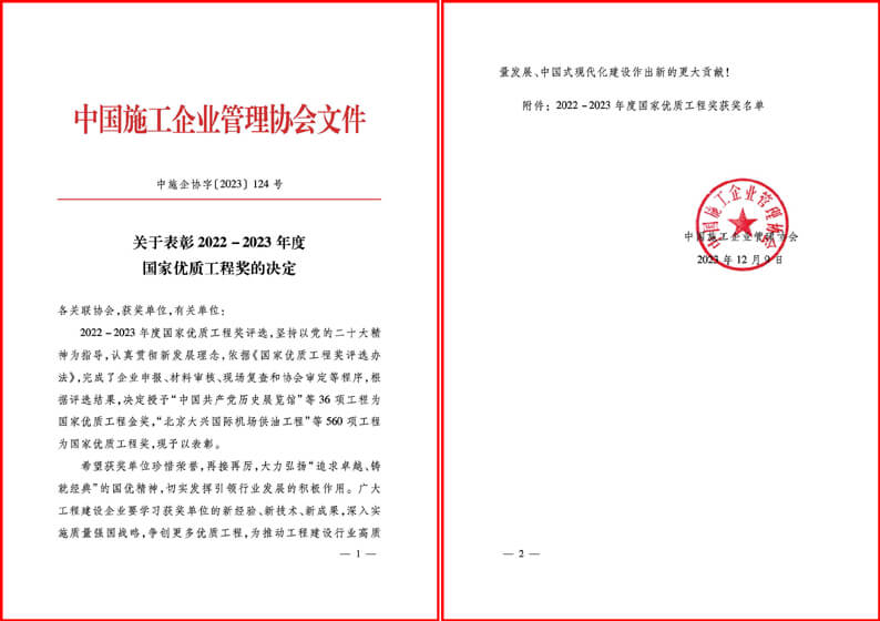 “国家优质工程奖”设立于1981年,是经国务院批准的我国工程建设领域设立最早,跨行业、跨专业的国家级质量奖,获奖项目中特别优秀的,方可授予“国家优质工程金奖”。