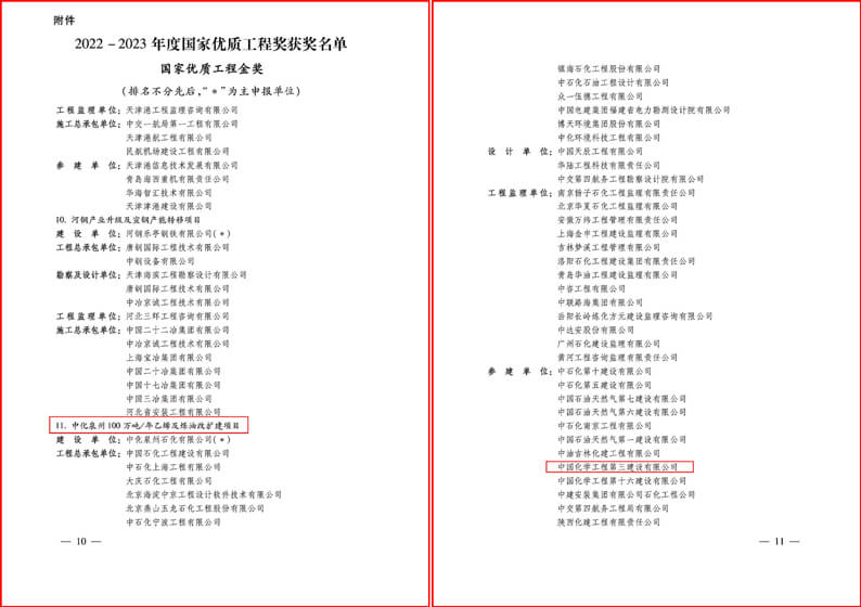 12月24日,2022-2023年度“国家优质工程奖”评选结果揭晓,华体会体育(中国)HTH·官方网站承建的中化泉州100万吨/年乙烯及炼油改扩建项目喜获“国家优质工程金奖”。至此,华体会体育(中国)HTH·官方网站荣获的“国家优质工程奖”增至15项,其中金奖6项。