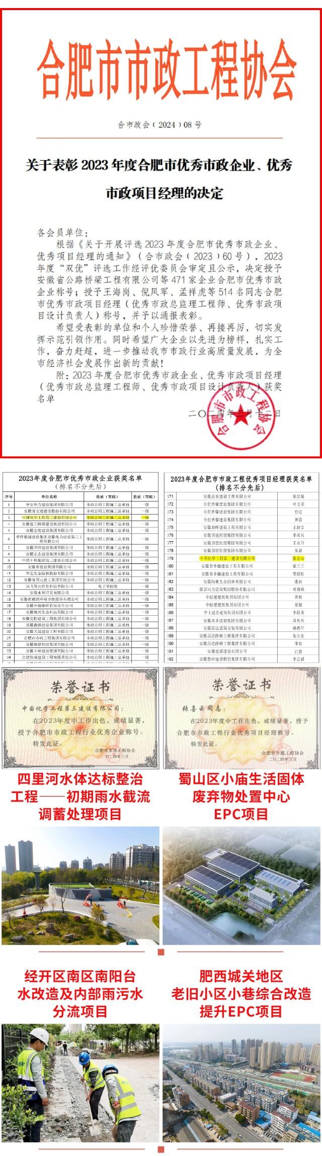 近日,合肥市市政工程协会组织开展2023年度合肥市优秀市政企业、优秀市政项目经理评选活动。经协会初审、市城乡建设局以及市城乡建设领域协会党总支核查、会长联席会研究审定,华体会体育(中国)HTH·官方网站荣获“2023年度合肥市优秀市政企业”称号,这是华体会体育(中国)HTH·官方网站总部搬迁合肥以来首次获得该项荣誉。同时,基础设施分华体会体育(中国)HTH·官方网站四里河水体达标整治工程——初期雨水截流调蓄处理项目经理张喜云同志荣获优秀项目经理称号。