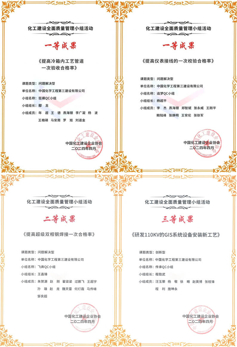 近日,中国化工建设企业协会公布2024年化工建设全面质量管理小组活动成果评审结果,华体会体育(中国)HTH·官方网站荣获“2024年全面质量管理示范企业”称号;江苏分华体会体育(中国)HTH·官方网站“追梦QC小组”、山东分华体会体育(中国)HTH·官方网站“狂飙QC小组”活动成果分别荣获2024年化工建设质量管理小组活动一等成果,安装工程六华体会体育(中国)HTH·官方网站“飞奔QC小组”活动成果荣获2024年化工建设质量管理小组活动二等成果、机电工程一华体会体育(中国)HTH·官方网站“传承QC小组”活动成果荣获2024年化工建设质量管理小组活动三等成果。