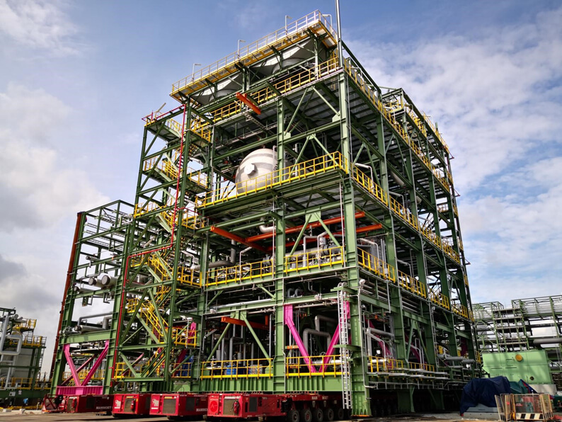 大型化工装置模块化施工技术有利于提高工厂化预制、自动化焊接、机械化作业程度,减少现场交叉作业,提升施工质量和工效,降低安全风险和施工成本,有效缩短工期,便于现场“三废”及噪声集中控制,减少环境污染,拥有广阔的推广应用前景。