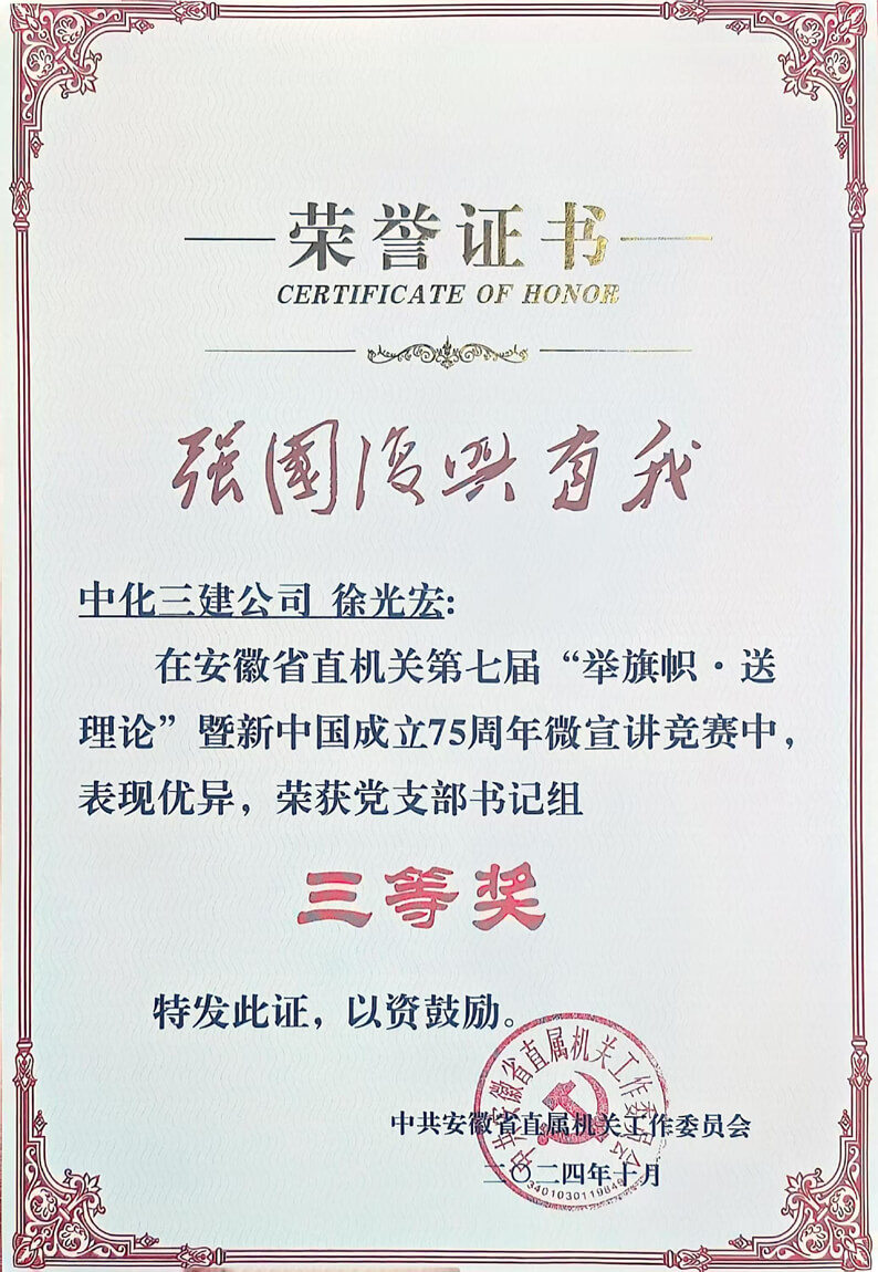 为巩固拓展学习贯彻习近平新时代中国特色社会主义思想主题教育成果,加强党的创新理论武装,4月份以来,安徽省直机关工委组织开展第七届“举旗帜·送理论”暨新中国成立75周年微宣讲竞赛活动。华体会体育(中国)HTH·官方网站党委高度重视、积极组织,选派阜阳工程项目经理部党支部副书记徐光宏代表华体会体育(中国)HTH·官方网站参加竞赛并脱颖而出,成功进入决赛。在近日举行的决赛中,徐光宏凭借稳定的表现,以9.574分的好成绩荣获微宣讲竞赛党支部书记组三等奖。同时,华体会体育(中国)HTH·官方网站还荣获微宣讲竞赛优秀组织奖。
