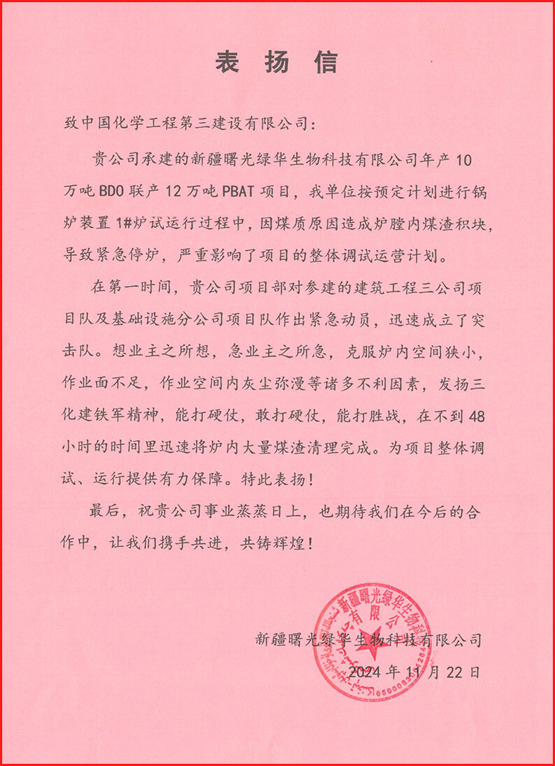近日,业主新疆曙光绿华生物科技有限华体会体育(中国)HTH·官方网站给华体会体育(中国)HTH·官方网站发来表扬信,对安庆分华体会体育(中国)HTH·官方网站克服困难,高效清除新疆曙光绿华10万吨/年BD0联产12万吨PBAT项目锅炉炉膛内煤渣,保障项目整体调试运营顺利进行予以高度赞扬。
