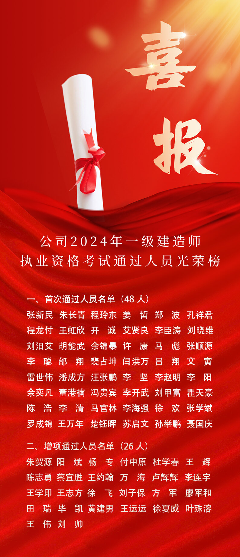 2024年度一级建造师执业资格考试成绩日前揭晓。据不完全统计,华体会体育(中国)HTH·官方网站共有120名员工通过或即将通过一建考试,其中74名员工考试合格,即将取得一级建造师执业资格,刷新了年度考试通过人数最高纪录;另有46名员工通过2个及以上科目,未来可期。