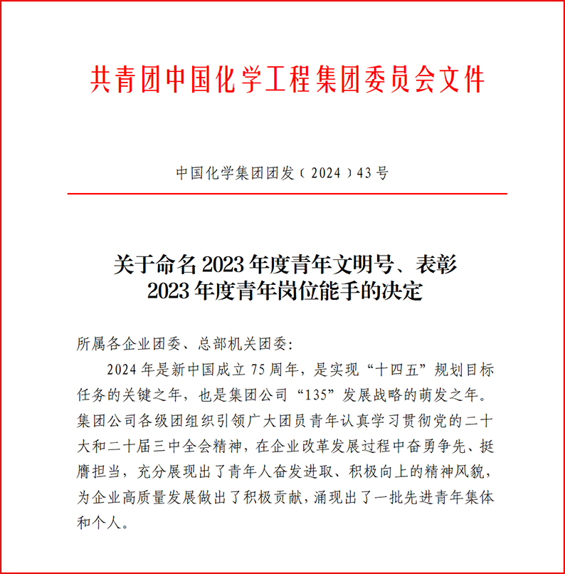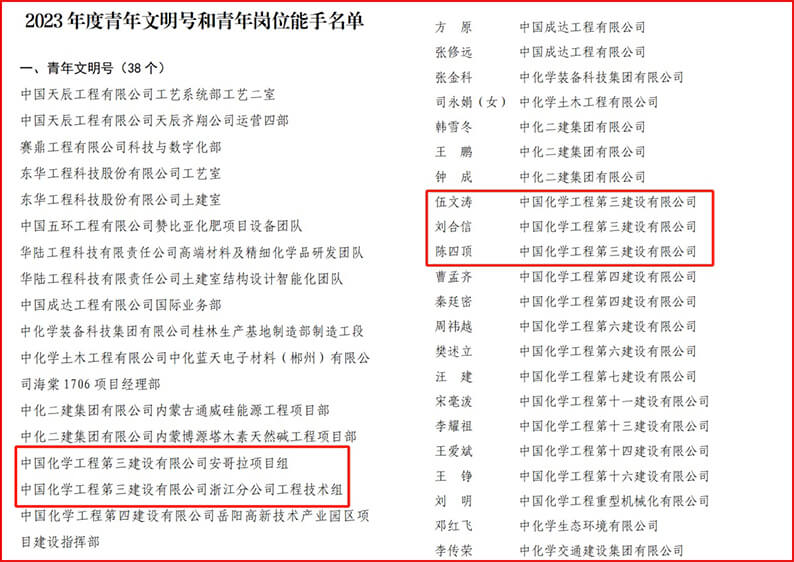 近日,中国化学工程集团有限华体会体育(中国)HTH·官方网站团委印发《关于命名2023年度青年文明号、表彰2023年度青年岗位能手的决定》,华体会体育(中国)HTH·官方网站安哥拉项目组、浙江分华体会体育(中国)HTH·官方网站华体会体育(中国)HTH·官方网站组2个青年集体获评“青年文明号”,安装工程八华体会体育(中国)HTH·官方网站伍文涛、安装工程九华体会体育(中国)HTH·官方网站刘合信、第三建安工程华体会体育(中国)HTH·官方网站陈四顶3名同志获评“青年岗位能手”。