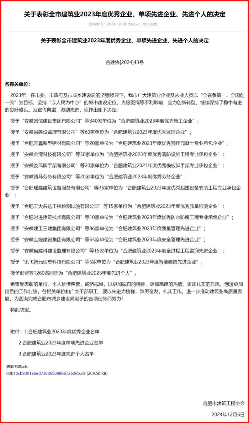 匠心筑精品丨华体会体育(中国)HTH·官方网站荣获合肥市2023年度“优秀施工企业”和“质量管理先进企业”