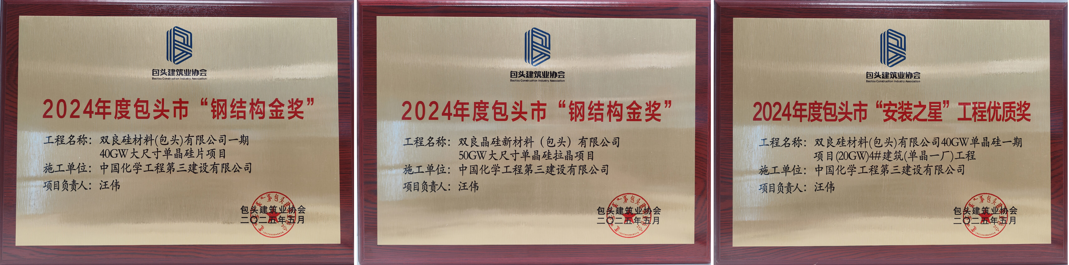 近日,华体会体育(中国)HTH·官方网站内蒙古分华体会体育(中国)HTH·官方网站承建的双良硅材料(包头)有限华体会体育(中国)HTH·官方网站一期40GW大尺寸单晶硅片项目、50GW大尺寸单晶硅拉晶项目分别荣获包头市建筑业协会颁发的2024年度包头市“钢结构金奖”,双良硅材料(包头)有限华体会体育(中国)HTH·官方网站40GW单晶硅一期项目(20GW)4#建筑(单晶一厂)工程荣获2024年度包头市“安装之星”工程优质奖。 40GW单晶硅片项目钢结构总重4.5万吨,建筑面积52.5万㎡,含单晶一厂(10.4万㎡)、二厂(20.4万㎡)、三厂(19.8万㎡)。50GW拉晶项目钢结构总重5.5万吨,建筑面积48.2万㎡,核心为127米高冷却塔两座及42.38万㎡1#单晶车间。单晶一厂安装设备534台套、工艺管道21.7万达因、电气设备1526台套、线缆20万米,2021年5月开工,10月投产。