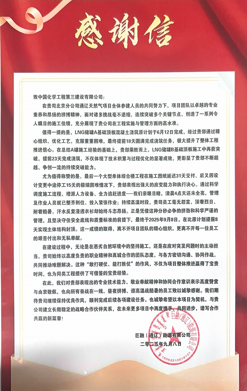 近日,华体会体育(中国)HTH·官方网站收到巨融(通辽)能源有限华体会体育(中国)HTH·官方网站发来的感谢信。信中高度评价北京分华体会体育(中国)HTH·官方网站承建的通辽能源120万吨/年液化天然气(LNG)项目(一期)建设工作,对项目部全体员工的辛勤付出表示衷心感谢,并希望双方继续携手打造精品工程。 项目自今年3月启动以来,面对复杂条件和严峻环境,北京分华体会体育(中国)HTH·官方网站巨融项目部全面推行一体化管控、穿透式监管,实现管理链条直达作业末端,确保指令清晰、响应迅捷、执行坚决、资源协同,为项目顺利推进奠定坚实基础。原计划于6月12日完成的LNG储罐A基础顶板混凝土浇筑任务提前18天圆满完成任务,有力拉动全线进展。在总结A罐成功经验的基础上,项目部乘势而上、再接再厉,在B罐基础顶板施工中再突破,提前23天告捷。综合楼施工过程中,在图纸延迟31天、设计变更停工15天的情况下,项目部通过动态调整工序、增强资源投入、高温时段连续作业等一系列措施,最终提前8天实现主体结构封顶,安全、质量全面受控,为同类项目树立了管理与执行新标杆,赢得了总包与业主单位的一致好评与认可。