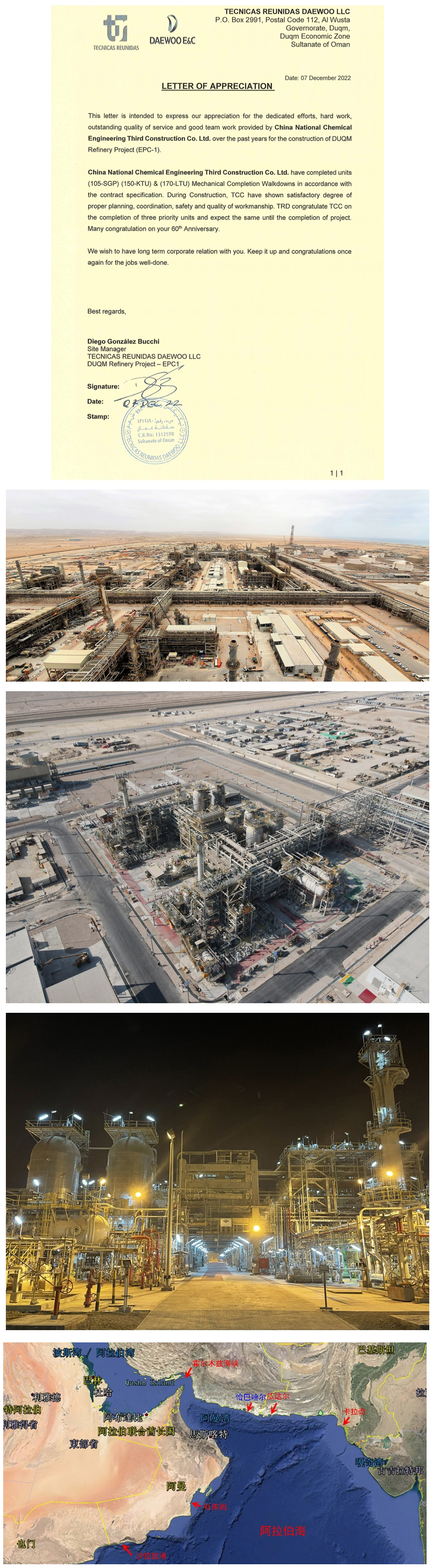 近日,阿曼杜库姆炼油项目联合总包西班牙TR华体会体育(中国)HTH·官方网站与韩国大宇华体会体育(中国)HTH·官方网站给华体会体育(中国)HTH·官方网站发来感谢信,对华体会体育(中国)HTH·官方网站承建的阿曼杜库姆炼油EPC1包U105饱和气体厂、150液化石油气装置与170柴油加氢装置实现高标准机械竣工表示祝贺与感谢。