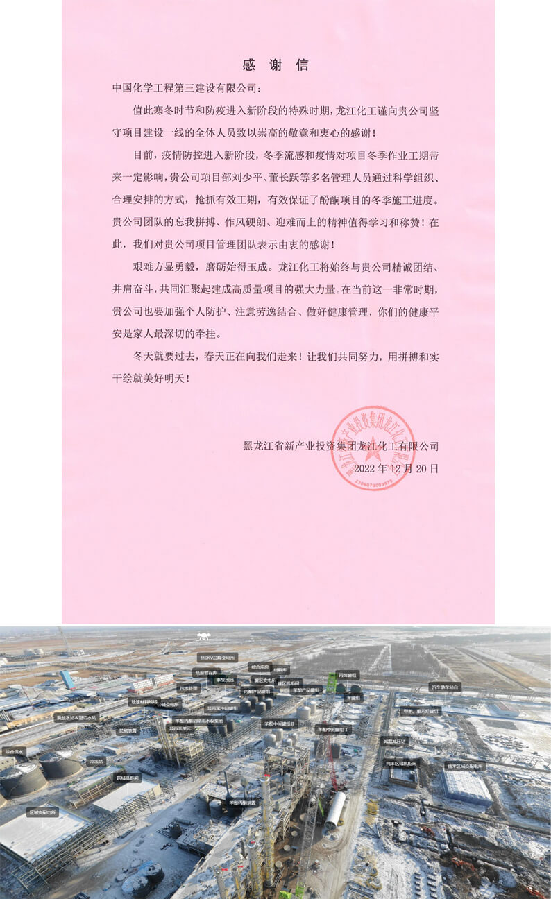 近日,黑龙江新产业投资集团龙江化工有限华体会体育(中国)HTH·官方网站给华体会体育(中国)HTH·官方网站发来感谢信,对华体会体育(中国)HTH·官方网站强化施工组织,有效保障龙江化工35万吨/年苯酚丙酮项目冬季施工进度表示感谢。