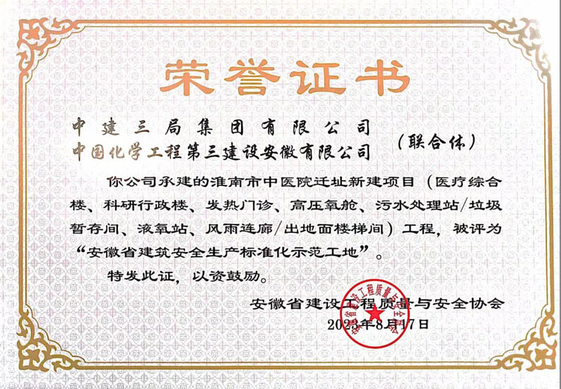 该项目荣获“安徽省建筑安全生产标准化示范工地”,体现了政府和行业协会对安徽有限华体会体育(中国)HTH·官方网站项目建设能力的充分认可,标志着有限华体会体育(中国)HTH·官方网站项目安全生产标准化管理工作取得新成果,为有限华体会体育(中国)HTH·官方网站属地深耕和滚动发展提供了有力支撑。有限华体会体育(中国)HTH·官方网站将以此为契机,再接再厉、奋勇争先,持续提升工程安全质量管理,努力向业主交付优质工程,为增强华体会体育(中国)HTH·官方网站在安徽地区的品牌影响力做出新的更大贡献。