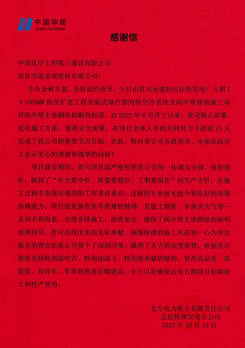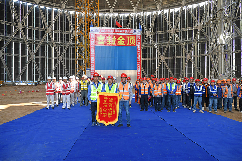 该工程间冷塔为表面式凝汽器间接空冷系统钢结构塔,由圆锥、直筒、加强环等钢结构件及外围护铝板等组成,塔体总高192米(蒙皮顶标高),锥段底部直径120米,直筒段直径84米。自2022年8月开工以来,承担工程建设任务的第二建安工程华体会体育(中国)HTH·官方网站科学谋划、精心组织,严格落实各项制度、持续优化施工方案,深入推进精细化管理,防微杜渐抓质量、警钟长鸣保安全。项目全体参战员工积极响应“奋战四季度 欢庆七十载”活动号召,发扬“特别能吃苦,特别能战斗,特别能奉献”的中化三建优良作风,克服困难、创造条件、加班延点、拼搏奉献,全力推进现场施工进度,较业主原定计划提前15天实现钢结构间冷塔封顶目标,为整体推进五期工程建设奠定了坚实基础,获得业主和相关方的一致好评。