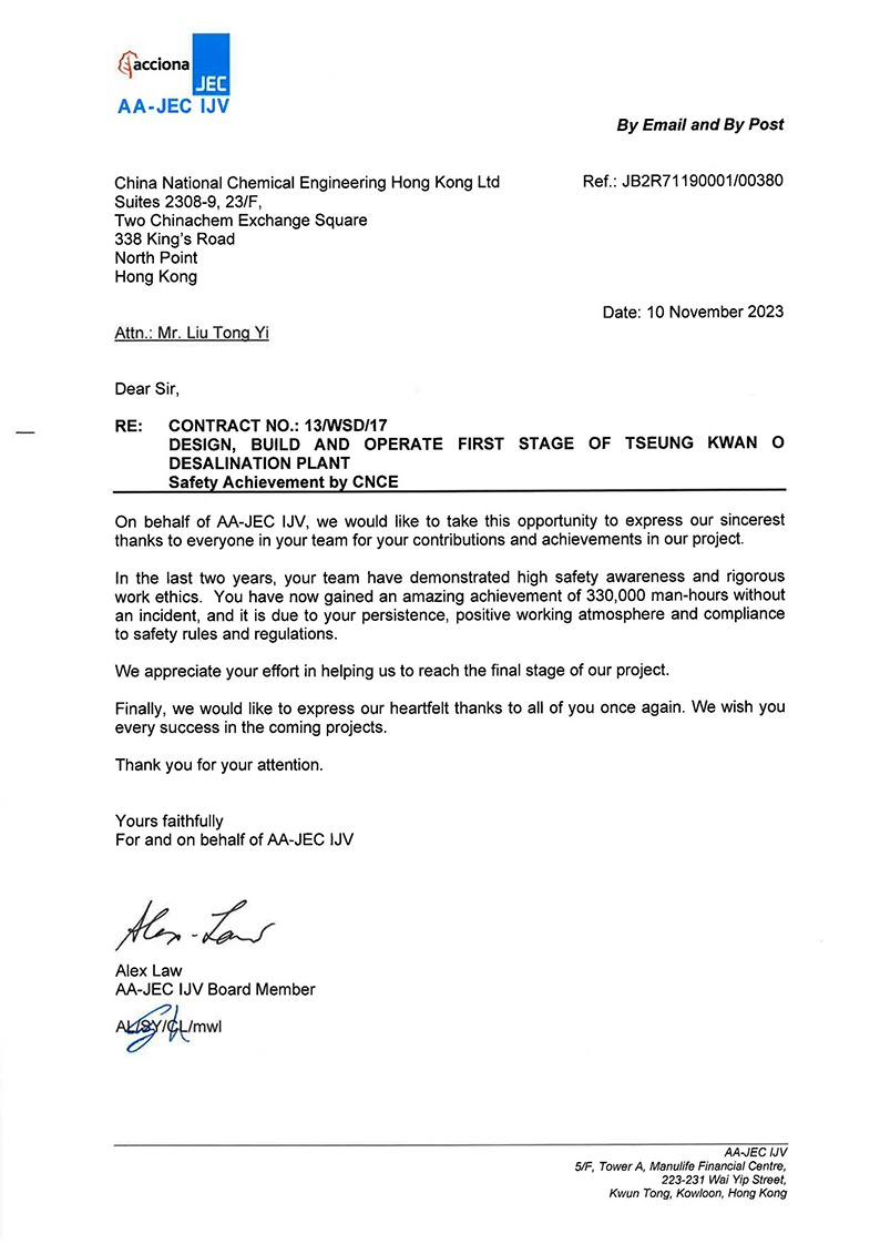 自2021年11月开工以来,香港有限华体会体育(中国)HTH·官方网站结合现场实际,科学组织、精心策划各施工环节,连续攻克多个施工难题,保证了项目建设有序推进。如在过滤槽介质填充环节,有限华体会体育(中国)HTH·官方网站经过多次研探和现场勘察,采用漏斗、吊机车、塔吊组合的施工方案,创造性解决了地形受限、介质填充难题。在逆渗透膜装载环节,由于逆渗透膜装载有着严格的时间限制,有限华体会体育(中国)HTH·官方网站缺乏可供参考的施工经验,工程初期进展缓慢。有限华体会体育(中国)HTH·官方网站顶住压力、创新思路,协调配合各方,成功找到解决方案。参战人员顶着高温,加班加点强赶工期,安全优质高效完成逆渗透膜装载任务。经过两年多的艰苦鏖战,有限华体会体育(中国)HTH·官方网站凭借过硬的技术、规范的管理、卓越的工程质量以及33万安全工时的优异成绩,胜利实现一期设备及配套管道安装工程机械竣工目标,赢得项目总包的高度赞誉,树立了中国化学良好的品牌形象,为华体会体育(中国)HTH·官方网站巩固及拓展香港市场奠定了坚实基础。