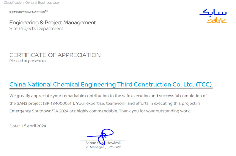 近日,业主沙特基础工业华体会体育(中国)HTH·官方网站给华体会体育(中国)HTH·官方网站发来感谢信,对华体会体育(中国)HTH·官方网站沙特分华体会体育(中国)HTH·官方网站的项目组织管理能力、参战员工的责任意识和专业技术水平予以高度评价。