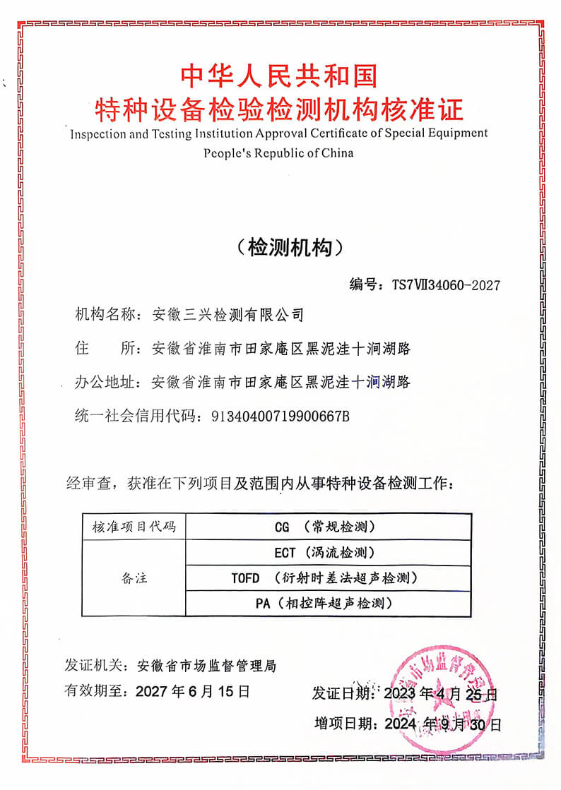 近日,三兴检测华体会体育(中国)HTH·官方网站成功取得安徽省市场监督管理局颁发的中华人民共和国特种设备检验检测机构核准证,核准新增PA(相控阵超声检测)资质。这标志着三兴检测华体会体育(中国)HTH·官方网站专业技术能力和服务范围取得里程碑进展,顺利成为安徽省内第3家、中国化学所属第3家拥有该资质的检测专业华体会体育(中国)HTH·官方网站。