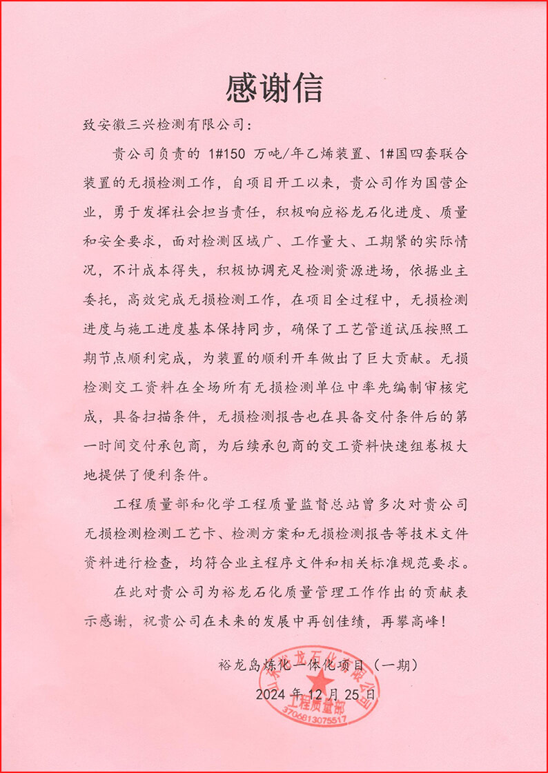 近日,山东裕龙石化有限华体会体育(中国)HTH·官方网站裕龙岛炼化一体化项目(一期)指挥部给华体会体育(中国)HTH·官方网站发来感谢信,对三兴检测华体会体育(中国)HTH·官方网站高效完成项目1#150万吨/年乙烯装置、1#国四套联合装置无损检测工作、保障装置顺利投产表示衷心感谢。